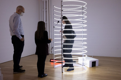 The other two works of the exhibition reckon with light’s relationship to time in the present moment. Alexandra Dementieva’s “Breathless” does this by mapping online linguistic trends in real time while also emphasizing the agency of the human subject within it: the piece itself can be altered when a participant breathes into the attached sensor. Raphaele Shirley’s “3 Tone Ephemeral”, celebrates light’s ability to affect the present moment rather than simply reflecting it. The installation envelops its surroundings in a series of emotional environments through automating various color combinations. Also featured in the piece is a sound installation between Shirley and the minimalist composer Rhys Chatham.